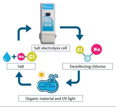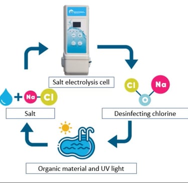 For a salt electrolysis to work, it is necessary to add salt to the pool beforehand. This salt is then converted into chlorine by the electrolysis cell. After reaction of the chlorine with algae and bacteria, the chlorine is converted back to salt.